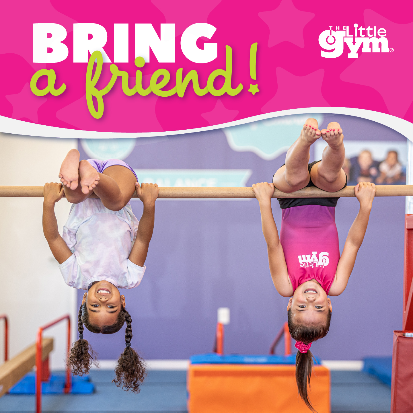 For one week only, members of The Little Gym can bring a friend to class—TOTALLY FREE! Whether it’s a school buddy, cousin, neighbor, or new pal, it’s the perfect way to share the Serious Fun. Show off your skills and watch the fun multiply. It’s the perfect way to flip, tumble, and giggle together!